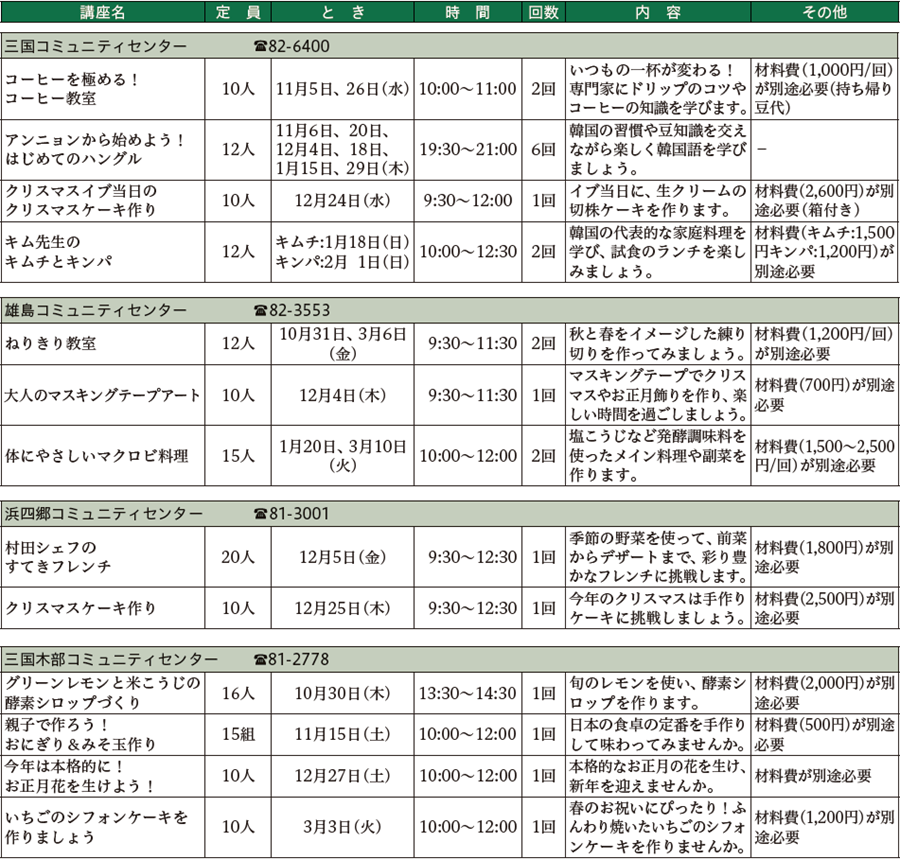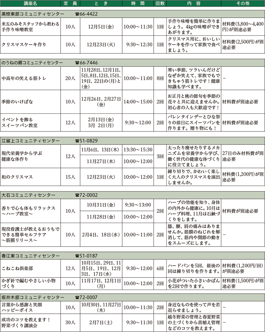 講座の内容など詳しくは、各コミュニティセンターまでお問い合わせください。