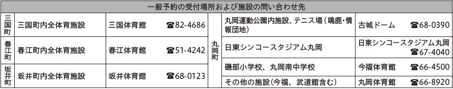 ※施設空き状況は市スポーツ協会ホームページ内「さかスポナビ」よりご確認いただけます。現在、改修工事中のため、春江B and G海洋センターは利用できません。春江町内体育施設に関するお問合せは、春江体育館までお願いします。