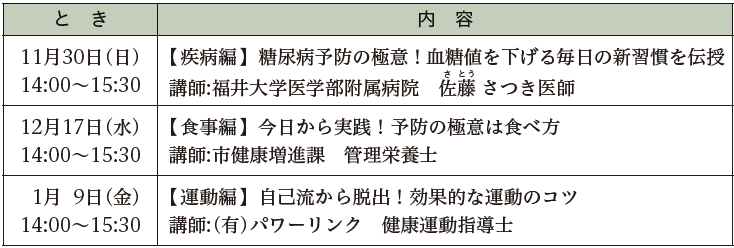 内容:糖尿病の予防について、疾病編、食事編、運動編と3回に分けて学びます。