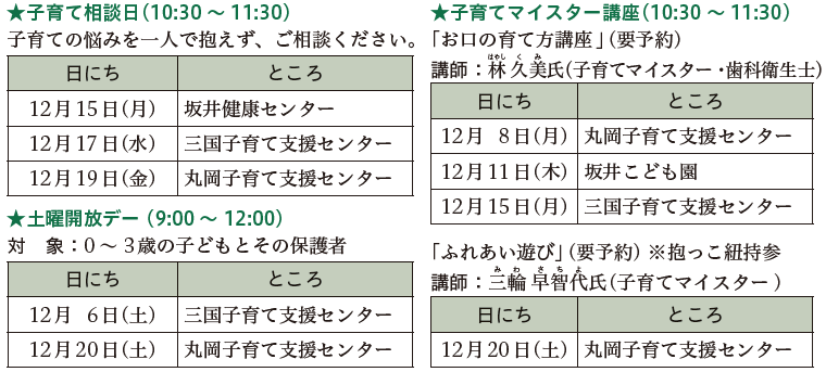 子育て 子育て支援センターからのお知らせ 9/14 前の記事 次の記事 発行日 : 2025年11月26日 自治体名 : 福井県坂井市 広報紙名 : 広報さかい お知らせ版 2025年11月号 問合せ:詳しくは、各子育て支援センターへ ・三国【電話】81-6550 ・丸岡【電話】67-4157 ・坂井【電話】68-4188 ※オンラインで予約できます Tweet シェアする 本のある生活。 行政番組「らしさ、かがやく。坂井市」(91ch) 12月の番組案内