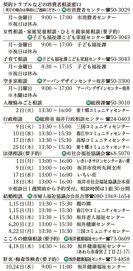 くらし 12月 相談日 12/14 前の記事 次の記事 発行日 : 2025年11月26日 自治体名 : 福井県坂井市 広報紙名 : 広報さかい お知らせ版 2025年11月号 相談は全て無料。 ※法律相談、こころの相談等は予約が必要です。事前にお尋ねください。 Tweet シェアする ボートレース三国 12月の開催日 休日診療