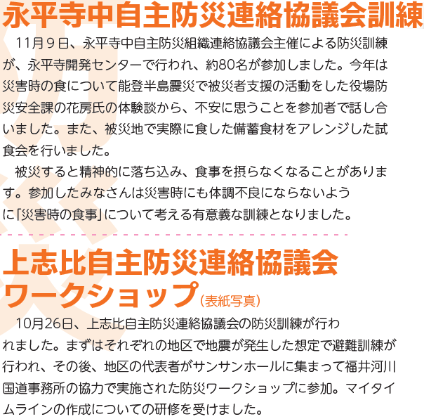 11月16日、永平寺開発センターで地区防災計画作成にともなうワークショップが開催され、町内4地区(松岡薬師2、松岡木ノ下、松岡上吉野、栃原)の区長、自主防災会長、民生委員など約25名が参加しました。