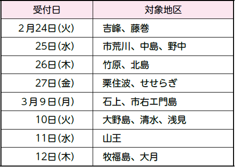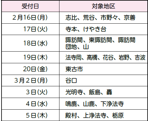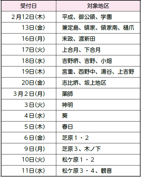 ※地区指定の日程では都合が悪い場合、上記の日程で受け付けます(土・日・祝日除く)