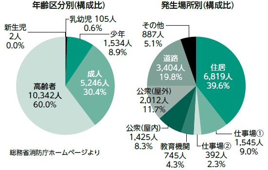 令和7年6月の全国における熱中症による救急搬送人員は17,229人です。これは、6月分の調査を開始した平成22年以降で最も多い搬送人員となっています。熱中症による救急搬送人員年齢区分別(構成比)では高齢者(満65歳以上)が最も多く10,342人(60.0%)で、発生場所別の救急搬送人員は住居が最も多く6,819人(39.6%)となっています。