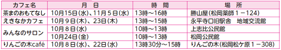 認知症カフェは、介護者、地域のみなさん、どなたでも自由に参加できます。認知症や病気の不安、介護方法などお茶を飲みながら話をしませんか。