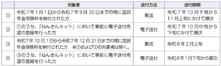日本年金機構から、次のスケジュールで「社会保険料(国民年金保険料)控除証明書」が対象者宛てに送付されますので、お手元に届きましたら、大事に保管し、年末調整や確定申告の際にご使用ください。
