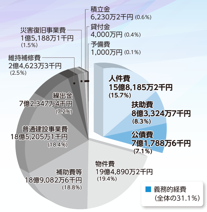 義務的経費について、人件費(※1)は前年度比9,172万4千円(6.2%)の増、扶助費(※2)は児童手当の制度拡充などにより1億508万3千円(14.4%)の増、地方債を償還するための公債費は、過去に実施した事業の償還が開始したことなどから5,579万1千円(8.4%)の増となりました。