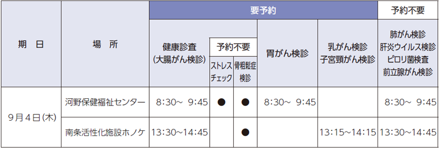 健康 9月の集団健康診査・がん検診のお知らせ 19/28 前の記事 次の記事 発行日 : 2025年08月25日 自治体名 : 福井県南越前町 広報紙名 : 広報 南えちぜん 令和7年(2025年)9月号 No.249 健康診査および一部のがん検診については予約が必要です。4月中旬にお届けの「受診券つづり」をご覧ください。 問合せ:保健福祉課 【電話】0778-47-8007 Tweet シェアする コンポスト肥料(名称:今庄エコロン)のお知らせ 無料相談