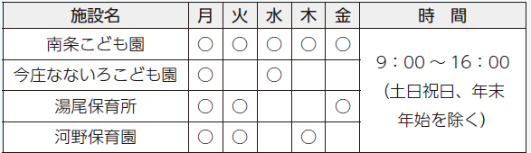 ※施設毎に利用人数の上限があります。また、行事等により利用できない日があります。急な利用が必要な場合等は、各園にご相談ください。