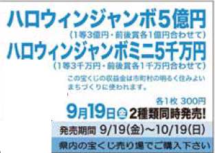 ハロウィンジャンボ宝くじの収益金は、市や町の明るく住みよいまちづくりに使われます。県内の宝くじ売り場で購入をお願いします。