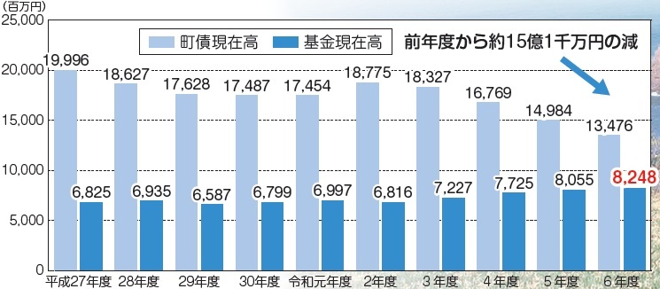 令和6年度末の一般会計、特別会計、企業会計を合わせた町債(借金)の現在高は134億7,669万5千円で前年度より15億768万4千円の減少、基金(貯金)の現在高は82億4,848万1千円で前年度より1億9,327万1千円の増加となりました。