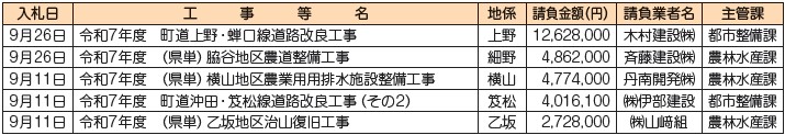 しごと 令和7年度 入札結果一覧 9月10日~10月7日 10/33 前の記事 次の記事 発行日 : 2025年11月01日 自治体名 : 福井県越前町 広報紙名 : 広報えちぜん 令和7年11月号 *金額の大きい順で上位5件を掲載しています。そのほかの入札結果については、町ホームページをご覧ください。 Tweet シェアする 町からのお知らせーえちぜんInformationー(3) 家庭ごみの正しい分け方・出し方