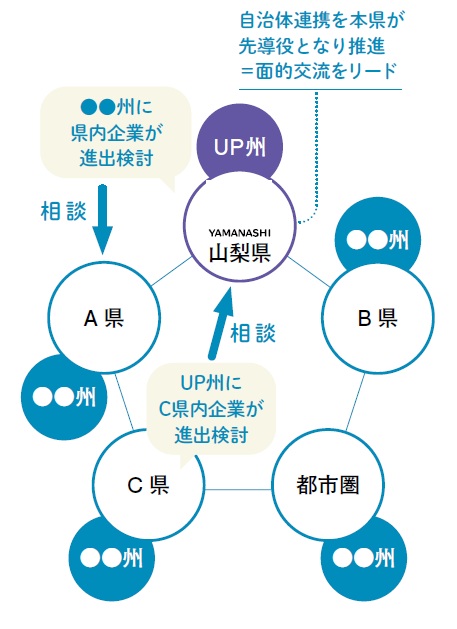 この構想は、山梨県とインドの一対一の関係ではなく、他県も巻き込んだ「面的な交流」を行うものです。具体的には、山梨県がインドと日本を結ぶ「扉=ゲートウェイ」となり、他県や首都圏など、日本全国の自治体と連携しながら、より広域で柔軟な国際ネットワークを形成するというビジョンです。例として、他の自治体から「UP州に進出したい団体・企業がある」「UP州の人材に興味がある」と相談を受けたとき、山梨県が橋渡し役となり、UP州との多様なつながりを促進していきます。UP州側から要請があったときも同様です。