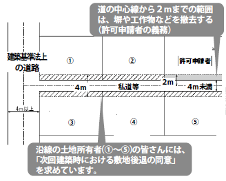 建物を建てる際、その敷地は、建築基準法上の道路に2m以上接しなければなりません。幅員が4m未満の道(私道等)のみに面した敷地の場合、建築確認の前に許可が必要となります。この許可にあたり、市では許可申請者に、沿線の土地所有者からの敷地後退の同意等を求めています。ご理解・ご協力をお願いします。