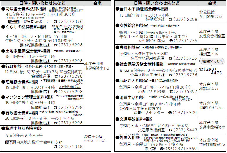 くらし 2月の相談 12/49 前の記事 次の記事 発行日 : 2026年02月01日 自治体名 : 山梨県甲府市 広報紙名 : 広報こうふ No.841 2026年2月1日号 ※祝日は除く Tweet シェアする 有価物などの収集日程表 私たち、男女共同参画推進委員です!