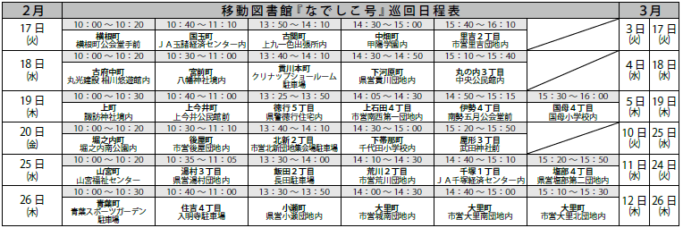 くらし 移動図書館『なでしこ号』巡回日程表 22/49 前の記事 次の記事 発行日 : 2026年02月01日 自治体名 : 山梨県甲府市 広報紙名 : 広報こうふ No.841 2026年2月1日号 Tweet シェアする 施設の情報(2) 随時受付中!地域の子育てに参加してみませんか?