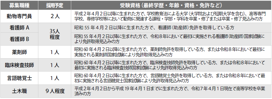受験資格(最終学歴・年齢・資格・免許など):昭和41年4月2日以降に生まれた方で、看護師(助産師)免許を取得している方および職員(任期付職員・会計年度任用職員等を除く)として受験職種の実務経験を3年以上有する方(ただし、育児休業・休職・停職の期間は実務経験から除く)