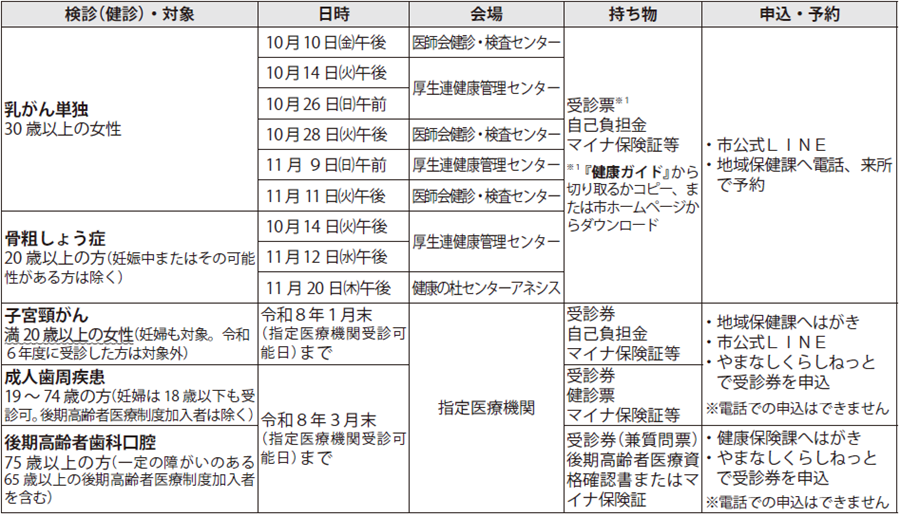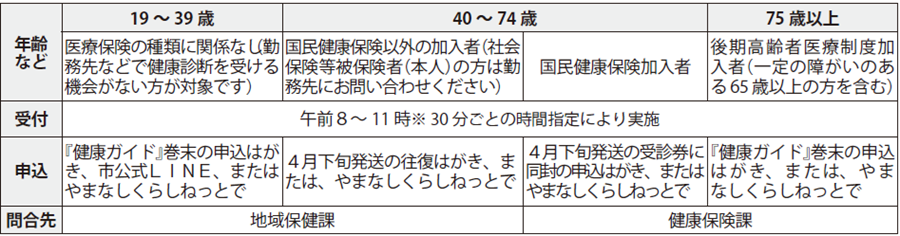 19~39歳の方、がん検診、社会保険加入の方、生活保護受給者等【電話】055-237-2505