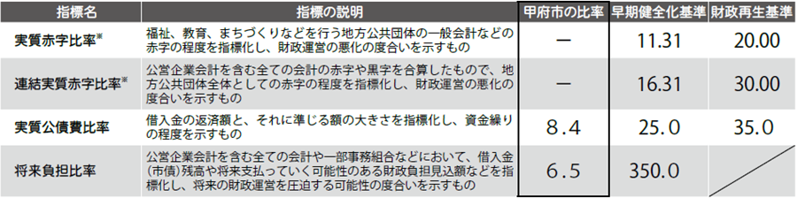 地方公共団体の財政運営の健全性を示す「健全化判断比率」や公営企業ごとの経営状況を示す「資金不足比率」は、早期・経営健全化基準を下回り、健全な財政運営を維持することができました。
