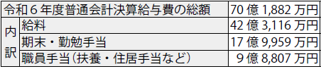 給与費とは、毎月支給される給料や民間会社のボーナスにあたる期末・勤勉手当、各種手当の合計です(退職手当、児童手当は除く)。