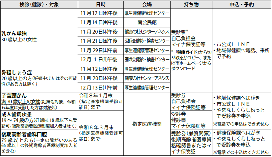・集団健診会場での乳がん検診はマンモグラフィ検査となります。詳しくは『健康ガイド』12ページをご覧ください(40歳以上で特定健診と同時に受診する女性のみ対象)