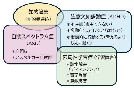 おおよそ下図のように分類され、知的障害を伴ったり複数の特性が重なったりする場合もあります。