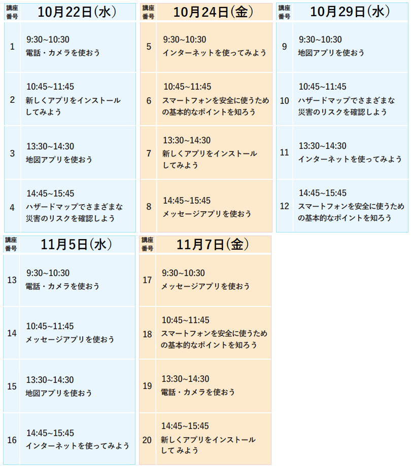 ◇参加無料 スマホ教室 講座日程(5日間開催)