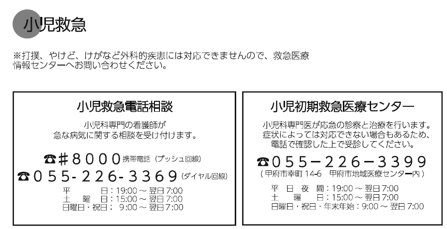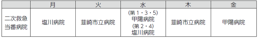 ○平日夜間(18:00〜翌日8:00) ※土曜日、日曜日、祝祭日の当番病院は下の表をご覧ください。