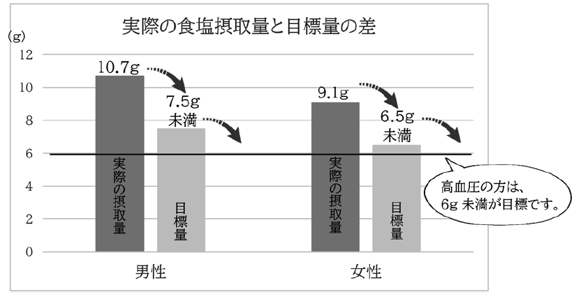 1日あたりの食塩摂取量は、成人男性7.5g未満、女性6.5g未満、高血圧の方は6.0g未満が目標となっています。しかし、令和5年度に行われた国民健康・栄養調査によると、食塩摂取量の平均値は、成人男性で10.7g、女性9.1gであり、目標量からかけ離れていることが分かります。