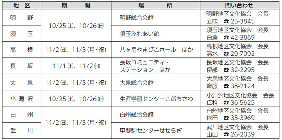 ○地区文化祭 ※地区文化祭の開催時間、内容などは各地区文化協会へお問い合わせください。