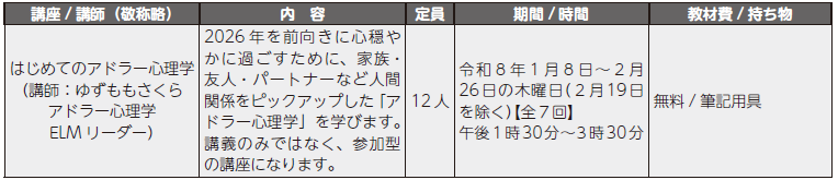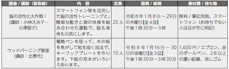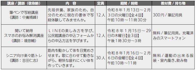 を、返信面(表)に住所・氏名を明記して申し込みください。応募多数の場合は抽選とし、結果を返信用はがきにてご連絡します(締切後7日以内に結果が届かない場合は、問い合わせください)。1枚の往復はがきで申し込みができるのは、1講座1人分です(往復はがき以外の申し込み、重複応募、記入漏れ等は無効)。