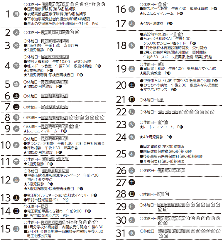 くらし 12月 情報カレンダー 37/41 前の記事 次の記事 発行日 : 2025年12月01日 自治体名 : 山梨県甲斐市 広報紙名 : 広報甲斐 令和7年12月号 ページの見方:黒丸に白字(例…黒丸P2)は裏表紙から数えたページ番号。白丸に黒字(例…白丸P2)は、表紙から数えたページ番号です 問い合わせ: 竜王庁舎【電話】055-276-2111 敷島庁舎【電話】055-277-3111 双葉庁舎【電話】0551-28-2211 Tweet シェアする せん定枝粉砕処理 甲斐市の人口