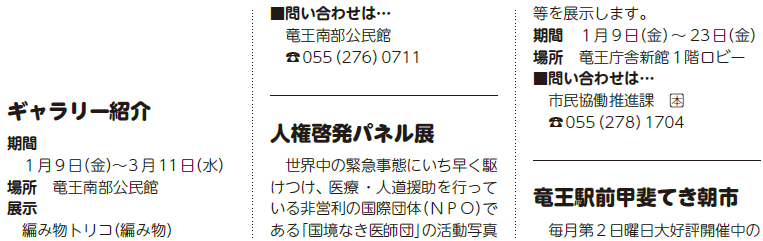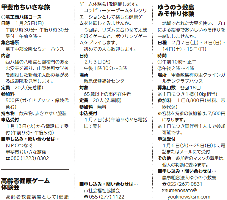 イベント [情報Clips]イベント 30/45 前の記事 次の記事 発行日 : 2026年01月01日 自治体名 : 山梨県甲斐市 広報紙名 : 広報甲斐 令和8年1月号 Tweet シェアする [情報Clips]講座・教室 公民館ふれあい講座