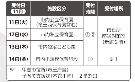 受付日程:次の受付日程表を確認し、必ず第1希望の園の受付日時にご来庁ください。