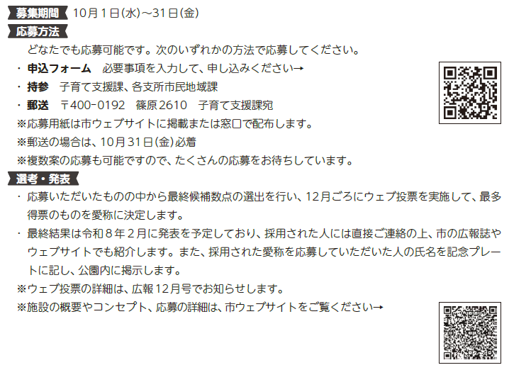 甲斐市の新たなランドマークとして、子どもが遊んで学ぶことができ、子育て支援や市民交流の場となる本施設にぴったりな、親しみやすく覚えやすい愛称を募集します。