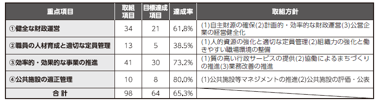 令和6年度に実施した98項目のうち、目標を達成した項目は64項目で達成率は65.3%でした。各項目ごとの達成状況は、次の表のとおりです。