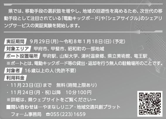 くらし 電動キックボード・シェアサイクル 実証実験スタート! 11/42 前の記事 次の記事 発行日 : 2025年10月01日 自治体名 : 山梨県甲斐市 広報紙名 : 広報甲斐 令和7年10月号 Tweet シェアする 助け合いのしるし ヘルプマーク クローズ・アップ
