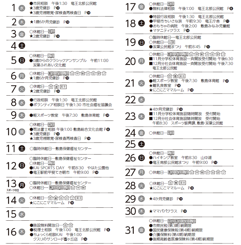 くらし 10月情報カレンダー 38/42 前の記事 次の記事 発行日 : 2025年10月01日 自治体名 : 山梨県甲斐市 広報紙名 : 広報甲斐 令和7年10月号 ページの見方:黒丸に白字(例…黒丸P2)は裏表紙から数えたページ番号。白丸に黒字(例…白丸P2)は、表紙から数えたページ番号です 問い合わせ: 竜王庁舎【電話】055-276-2111 敷島庁舎【電話】055-277-3111 双葉庁舎【電話】0551-28-2211 Tweet シェアする せん定枝粉砕処理 甲斐市の人口