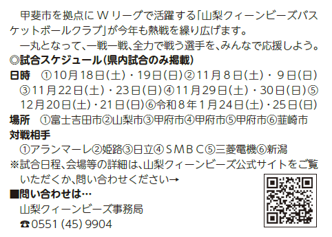 スポーツ 山梨クィーンビーズを応援しよう!~Wリーグ2025-26が開幕します~ 23/42 前の記事 次の記事 発行日 : 2025年10月01日 自治体名 : 山梨県甲斐市 広報紙名 : 広報甲斐 令和7年10月号 Tweet シェアする [情報Clips]お知らせ [情報Clips]環境
