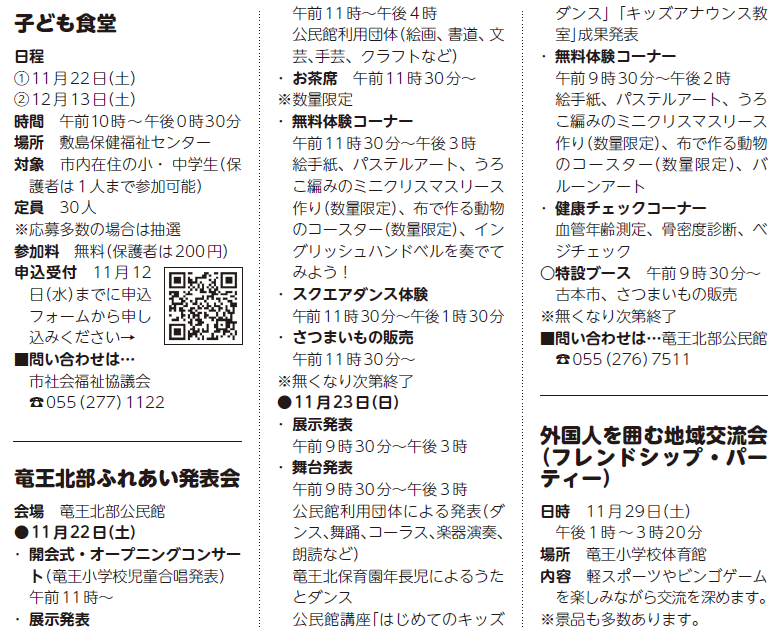 イベント [情報Clips]イベント(2) 28/41 前の記事 次の記事 発行日 : 2025年11月01日 自治体名 : 山梨県甲斐市 広報紙名 : 広報甲斐 令和7年11月号 Tweet シェアする 公民館ふれあい講座 公民館子どもふれあい講座