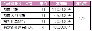 助成サービスごとに、事業者に支払った利用料のうち、上表基準額までは50%を助成します。助成額は100円未満切り捨てです。