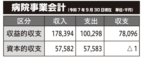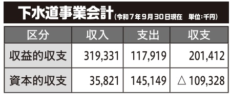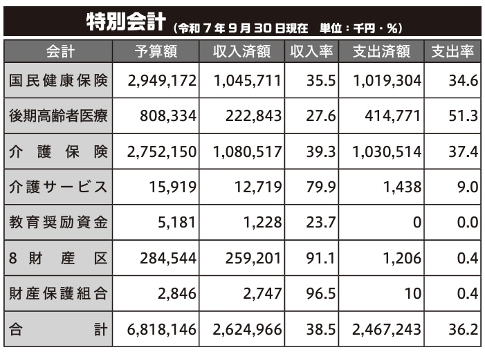 ▲令和7年度上半期の特別会計は、収入済額が26億2,496万6千円(収入率38.5%)、支出済額が24億6,724万3千円(支出率36.2%)となっています。