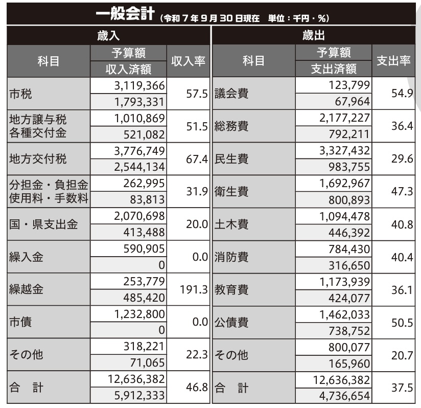 ▲令和7年度上半期の一般会計では、歳入が、収入済額59億1,233万3千円(収入率46.8%)となっています。その主なものは、市税の17億9,333万1千円、地方交付税の25億4,413万4千円などです。歳出は、支出済額47億3,665万4千円(支出率37.5%)となっています。その主なものは、民生費の9億8,375万5千円、公債費の7億3,875万2千円、衛生費の8億89万3千円などです。