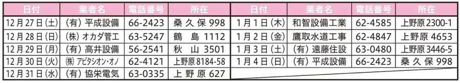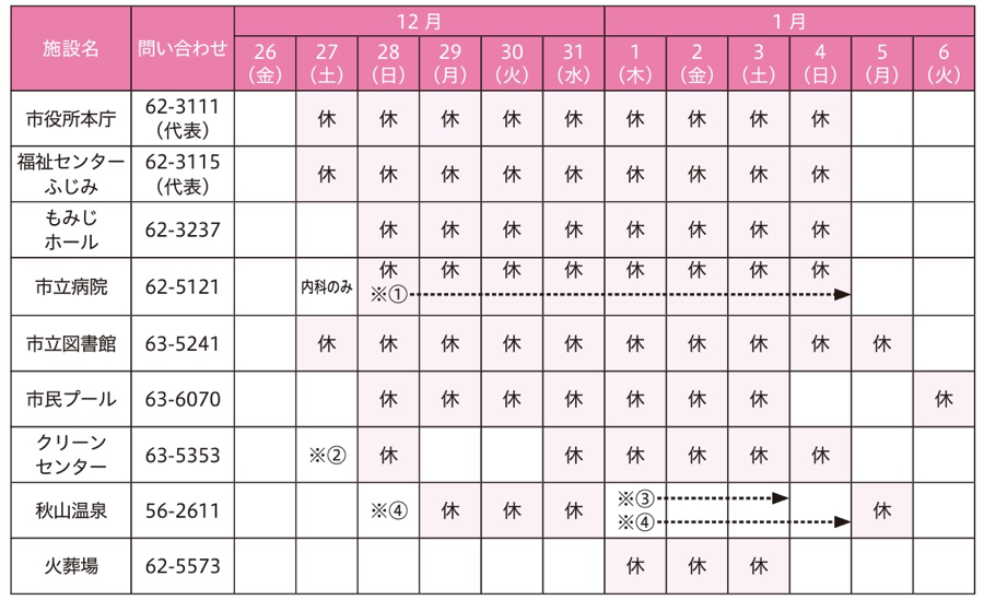※(1)救急のみの対応となります。なお、12月30日(火)、1月2日(金)は小児科のみ診察を行います(午前8時〜11時30分受付)。