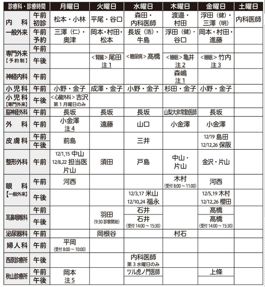 注1:腎臓内科、神経内科は完全予約制です。初診で受診希望の人は、平日午後1時〜4時に電話で予約してください。また、来院の際は、
