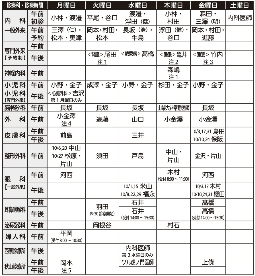注1 腎臓内科、神経内科は完全予約制です。初診で受診希望の人は、平日午後1時~4時に電話で予約してください。また、来院の際は、紹介状を持参してください。
