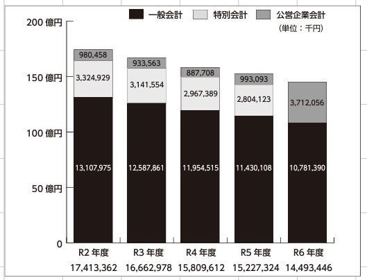 ※下水道事業および簡易水道事業の公営企業法適用にともない、令和6年度より両事業の起債残高は、公営企業会計に加算されています。