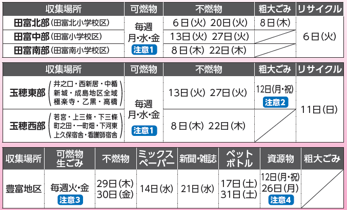 注意1:田富、玉穂地区の1月2日(金)の可燃物収集は4日(日)に変更になります。1月12日(月・祝)の可燃物収集は通常通り行います。