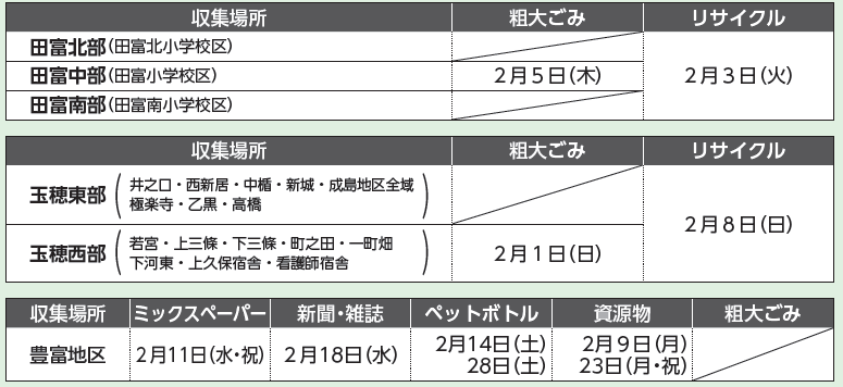 来月(2月)は、次のとおり「粗大ごみ」と「資源物」の収集を予定しています。