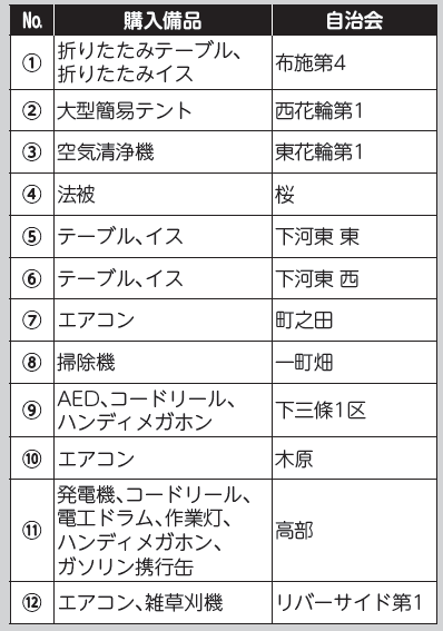 宝くじの社会貢献広報事業として、宝くじの受託事業収入を財源として実施しているコミュニティ助成事業を活用し、12自治会の集会施設の備品を整備しました。今後のコミュニティ活動のさらなる活性化が期待されます。